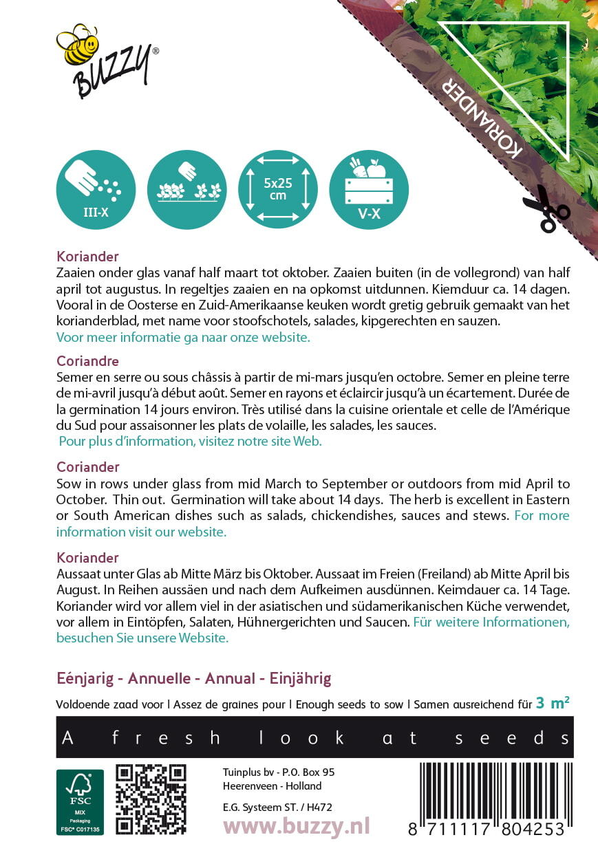 Zaaien onder glas vanaf half maart tot oktober. Zaaien buiten (in de vollegrond) van half april tot augustus. In regeltjes zaaien en na opkomst uitdunnen. Kiemduur ca. 14 dagen. Vooral in de Oosterse en Zuid-Amerikaanse keuken wordt gretig gebruik gemaakt van het korianderblad, met name voor stoofschotels, salades, kipgerechten en sauzen.