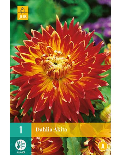 De grootbloemige, decoratieve dahlia ‘Akita' is een dankbare zomerbloeier die u maandenlang plezier geeft. Dahlia 'Akita' bloeit de hele zomer van juli tot de eerste nachtvorst. Dahlia 'Akita' wordt ongeveer 90-100 cm. hoog. Soms is het nodig om de bloemstengels te steunen. Dahliaknollen kunt u in het voorjaar planten. Dahlia 'Akita' is vorstgevoelig, pas dus wel op met late nachtvorst. Graaf een ruim plantgat, maak de aarde los en vul het plantgat met goede potgrond. Leg de knollen voorzichtig in het plantgat en dek af met 3-5 cm. aarde. De plantafstand van de knollen van dahlia 'Akita' is 30-60 cm. Geef na het planten de knollen meteen wat water. Dahlia's bloeien het rijkst in de volle zon. Bewaar de knollen na de bloei op een vorstvrije plaats en u heeft er jarenlang plezier van. Dahlia 'Akita' is goed te combineren met vaste planten en andere dahlia soorten. De rode bloemen zijn echte blikvangers in de border. Dahlia ‘Akita’ is ook een uitstekende snijbloem en lang houdbaar op de vaas. Het beste tijdstip om dahlia's te snijden is vroeg op de dag. Zet de stelen direct in lauwwarm water met snijbloemenvoedsel.