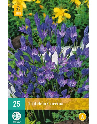 Triteleia Corrina bloeit met blauwe bloemen. De bloeiwijze lijkt een beetje op de Allium. De planttijd is april-mei. De bloeitijd is juni / juli. Hoogte 50 cm. Het is mooi om ze tussen andere planten te planten zoals lage siergrassen.
