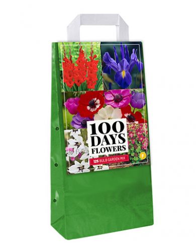 125 zomerbloeiende bloembollen in 5 soorten: 25 Iris Hollandica (blauw); 25 Gladiolus callianthus (wit); 15 Gladiolen 'Traderhorn (rood); 35 Oxalis Iron Cross (lila-roze) en 25 Anemonen de Caen (gemengde kleuren).
