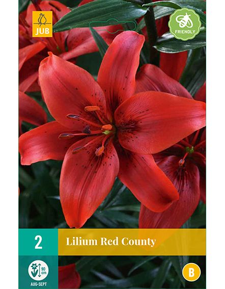 De rood aziatische lelie 'Red County' is met zijn bijzondere kleur een schitterende tuin- en snijbloem. De hoogte is 120 cm. Lelies komen mooi tot hun recht in groepjes tussen vaste planten en struiken. Na de bloei kunnen ze rustig in de grond blijven en zullen jaar na jaar weer tot volle bloei komen. De lelies zijn ook zeer geschikt voor in bloempotten of plantenbakken.