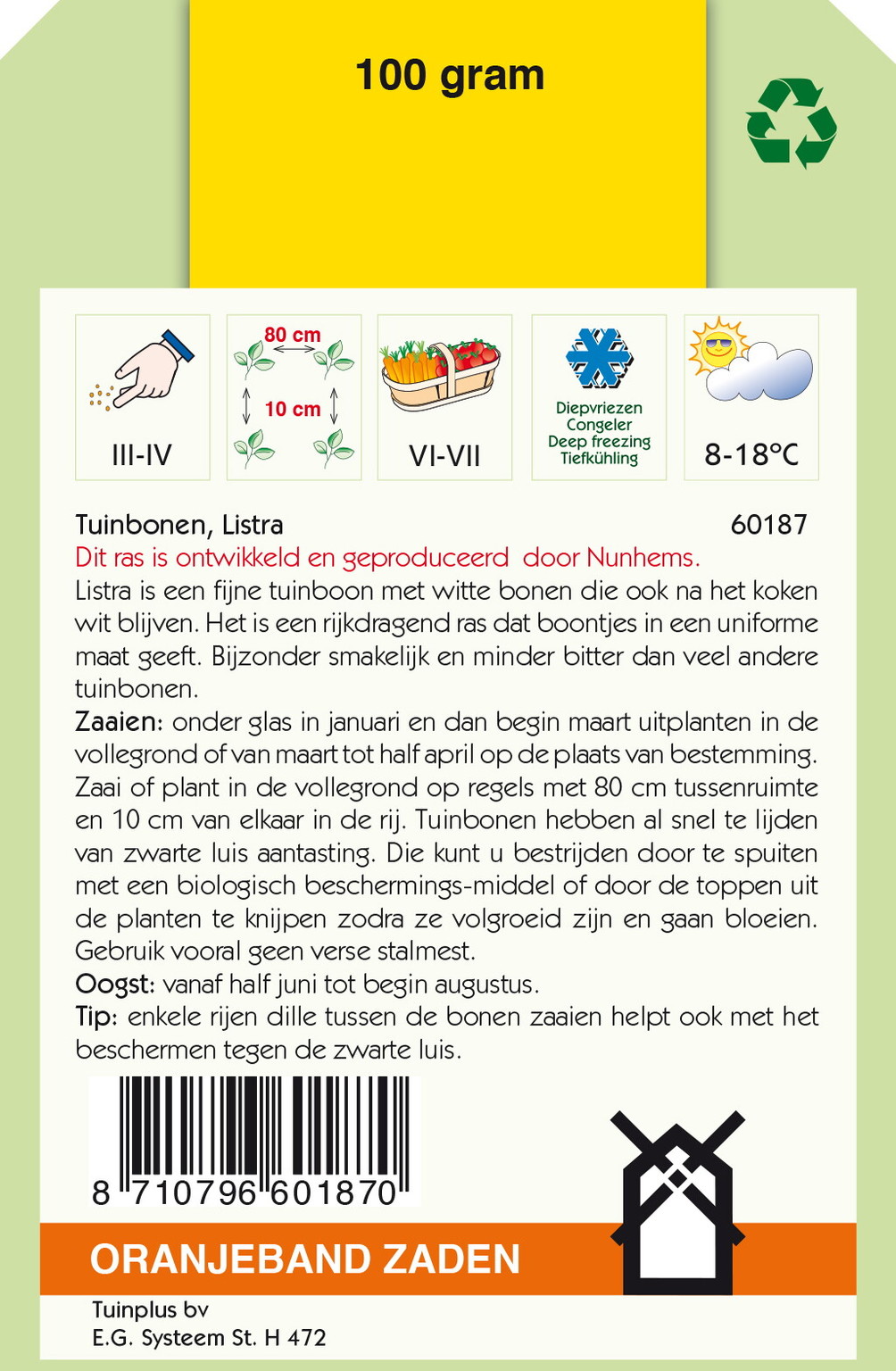 Listra is een fijne tuinboon met witte bonen die ook na het koken wit blijven. Het is een rijkdragend ras dat boontjes in een uniforme maat geeft. Bijzonder smakelijk en minder bitter dan veel andere tuinbonen. _x000D_