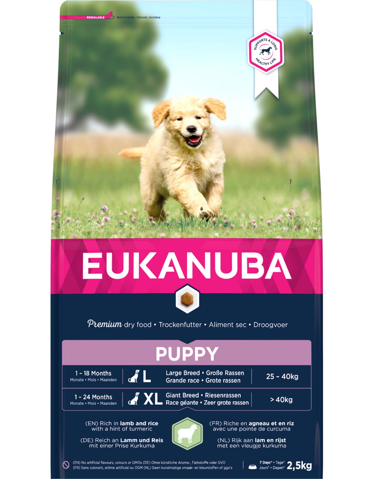 Speciaal afgestemd vezelmengsel van prebiotica (FOS), MOS en bietenpulp om een gezonde spijsvertering te bevorderen Calcium to support healthy bone growth and development Rijk aan lam: een natuurlijke eiwitbron die bijdraagt aan soepele spieren DHA to help puppies learn and be more trainable Natuurlijke bronnen van omega 6 en 3 om een gezonde huid en een glanzende vacht te ondersteunen Kurkuma: een natuurlijke bron van antioxidanten
