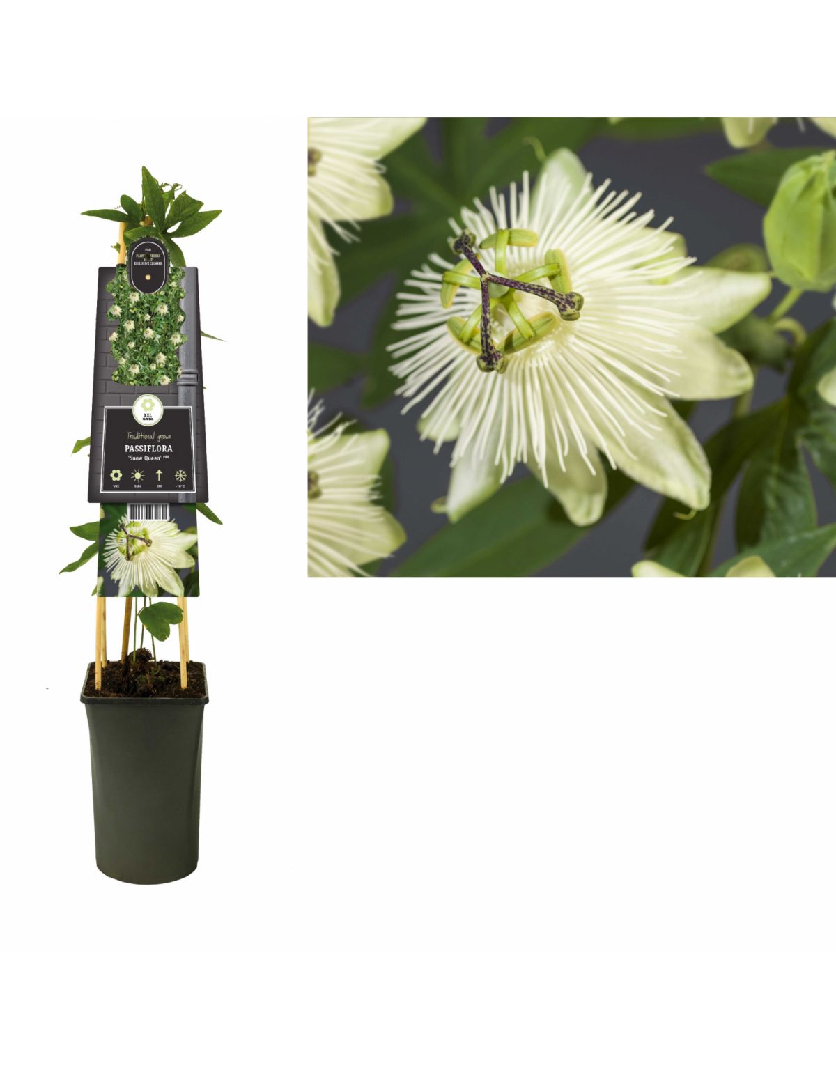 Deze klimplant Passiflora Snow Queen PBR Is incl. pot 75 cm hoog en volgroeid in ongeveer 3 jaar. Hij kan een hoogte bereiken van ongeveer3 meter. Deze Passiflora Snow Queen PBR bloeit van Mei-September met bloemen in de kleur wit en is matig winterhard. Deze klimplant kan gesnoeid worden. Uitgebreide informatie staat op het plantetiket.