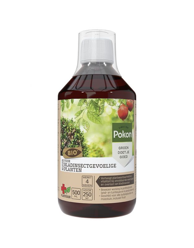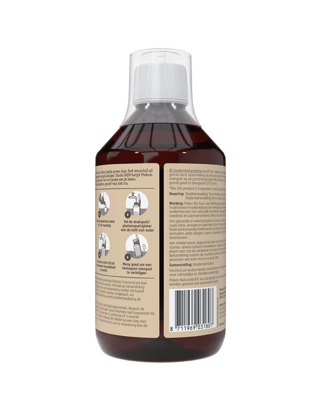 Pokon Bio Kuur voor Weerbare en Gezonde Planten Concentraat is een traditioneel kruidenextract ter verhoging van de weerbaarheid. De kruiden ondersteunen het natuurlijk herstellend vermogen, werken verzorgend, voedend en plantversterkend. Het is dus geen pesticide. Een gezonde en weerbare plant is minder vatbaar voor invloeden van buitenaf, zoals hitte, droogte en kou. Het middel wordt opgenomen door het blad of wortel van de planten, die de aanmaak van secundaire wortels stimuleert en daardoor een sterker afweersysteem ontwikkelt. Na behandeling kunnen de vruchten zonder problemen gegeten worden. Was je groenten wel even voor je ze gaat eten. Pokon Bio Kuur voor Weerbare en Gezonde Planten Concentraat kan gedurende de hele groeiperiode gebruikt worden. Herhaal de behandeling iedere 4 weken. Mocht het nodig zijn kan de behandeling sneller herhaald worden. Het concentraat kan op 2 manieren worden toegepast, via bladbehandeling of via bodembehandeling, waarbij bladbehandeling de voorkeur heeft. Bij bladbehandeling wordt het middel via het blad opgenomen. Bespuit de bladeren (boven- en onderkant) tot afdruipen. Deze methode niet toepassen bij hoge temperaturen (boven 25 graden Celsius). Bij voorkeur ’s ochtends of ’s avonds gebruiken, om fel zonlicht te vermijden. Gebruik dit middel op een dag met zacht weer, zonder regen en wind. Regen binnen 6 uur na toepassing kan de werking doen verminderen. Bij bodembehandeling wordt het middel via de wortels opgenomen. Maak de grond eerst oppervlakkig los met de hand, hark of schoffel. Giet daarna het mengsel op de grond bij de plant. Wij raden aan om direct na behandeling de grond goed te beregenen (5-10mm). Let op: de kruiden zullen een geur afgeven.