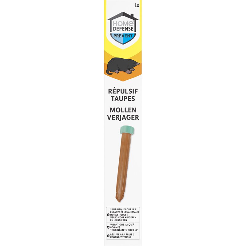 HOME DEFENSE® Mollenverjager en Woelmuizenverjager 800m² werkt op basis van trillingen. Mollen hebben een extreem goed ontwikkeld gehoor en zijn zeer gevoelig voor trillingen in de bodem. Het apparaat produceert elke 30 seconden een vibrerend geluid dat zich door de grond verspreidt tot maximaal 800m² (afhankelijk van de grondsoort). De trillingen zijn intimiderend voor knaagdieren, omdat ze deze associëren met een inkomende dreiging (zoals een naderend roofdier). Zodra het apparaat is aangesloten werkt het direct 24 uur per dag. Het apparaat is waterdicht, bevat geen chemicaliën, is veilig in gebruik en veilig voor kinderen en huisdieren.