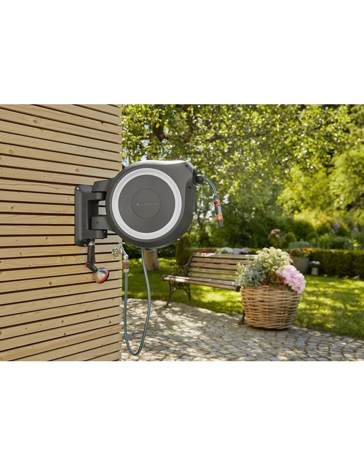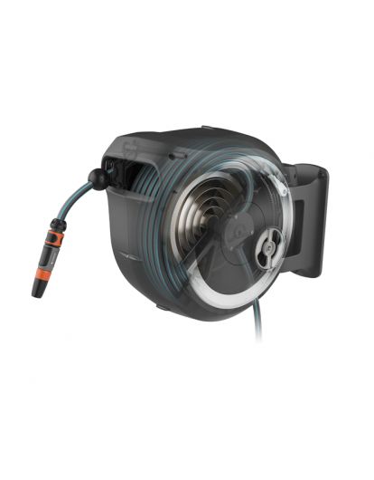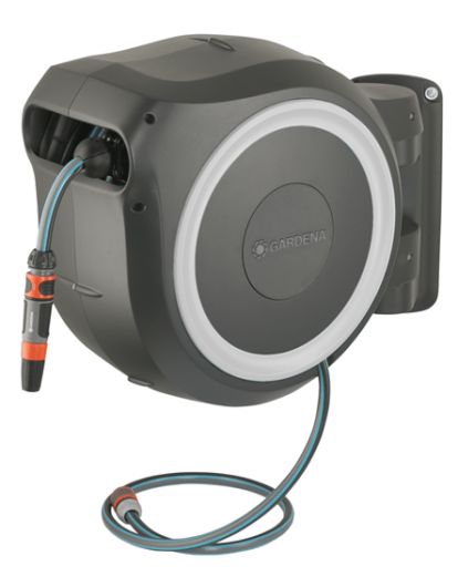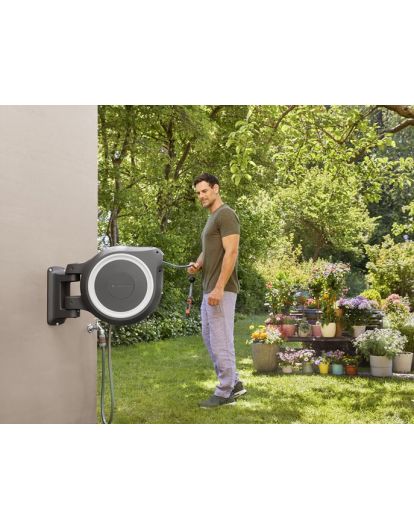 Met de wandslangenbox RollUp XL is het bewateren van een grote tuin aangenaam en eenvoudig. U bevestigt de compacte slangopslag permanent op de muur van uw huis en sluit deze met een aansluitslang aan op de kraan. Dankzij de 35 meter lange slang en de 180 graden draaibare slangenbox is het heerlijk om uw planten te bewateren en is dit geen corvee meer. De slangenhouder volgt uw bewegingsrichting en voorkomt dat de slang gaat knikken of in de war raakt. Nadat u de slang tot de gewenste lengte voor het bewateren hebt uitgetrokken, grijpen de zeer korte vergrendelingspunten zich automatisch vast en blokkeren ze de slang zodra u stopt. Door lichtjes aan het uiteinde van de slang te trekken, wordt het vergrendelmechanisme ontgrendeld en wikkelt een geïntegreerde stalen veer de verlengde tuinslang volledig automatisch, betrouwbaar en gelijkmatig voor u op. Dankzij de innovatieve RollControl-technologie gebeurt het oprollen veilig en gecontroleerd. De geïntegreerde slanggeleider zorgt ervoor dat de slang netjes en gelijkmatig wordt opgerold, zonder dat deze in de knoop raakt. De kraan- en slangaansluitingen van de slangenbox maken deel uit van het Original GARDENA System, zodat u op elk gewenst moment andere GARDENA opzetstukken kunt aansluiten. U hebt altijd uw GARDENA mondstukken bij de hand: ze kunnen onder de muurbeugel worden bevestigd en daar worden opgeborgen om ruimte te besparen. Het hoogwaardige materiaal is UV- en vorstbestendig en bestand tegen weersinvloeden. Daarom kan het systeem het hele jaar door worden gebruikt. Bovendien is de slangopslag beveiligd met een antidiefstalvoorziening. Alle benodigde aansluit- en montageonderdelen worden bijgeleverd in de wandslangenbox RollUp: een muurbeugel, een aansluitslang, alle benodigde Original GARDENA System onderdelen en een mondstuk met twee verschillende sproeiopties. GARDENA geeft vijf jaar garantie op de hoogwaardige slangopslag. Bewatering die altijd gebruiksklaar is , dankzij de GARDENA wandslangenbox RollUp XL.