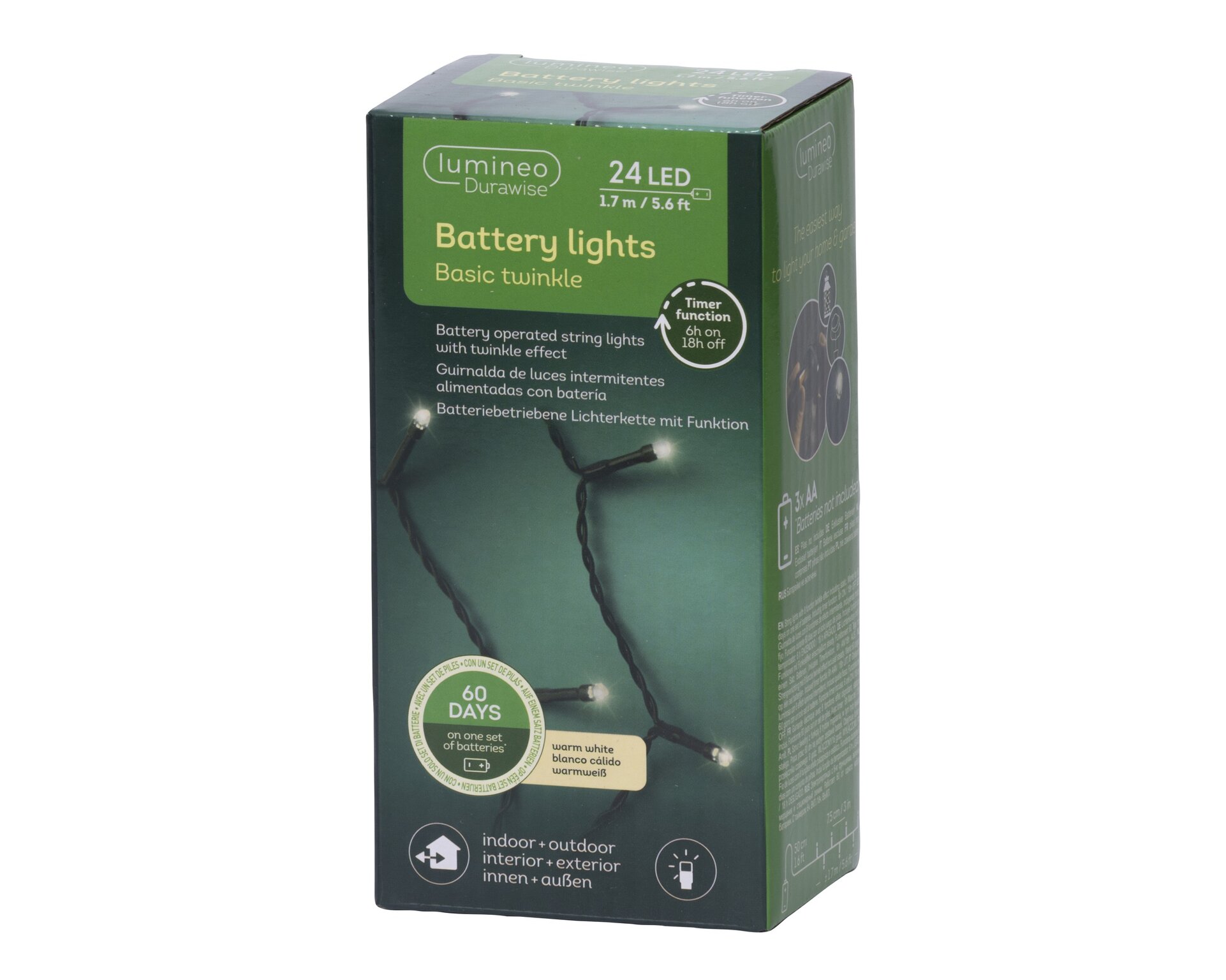 - Aantal lampjes: 24 warm wit lampjes, afstand tussen de lampjes: 7,5 cm