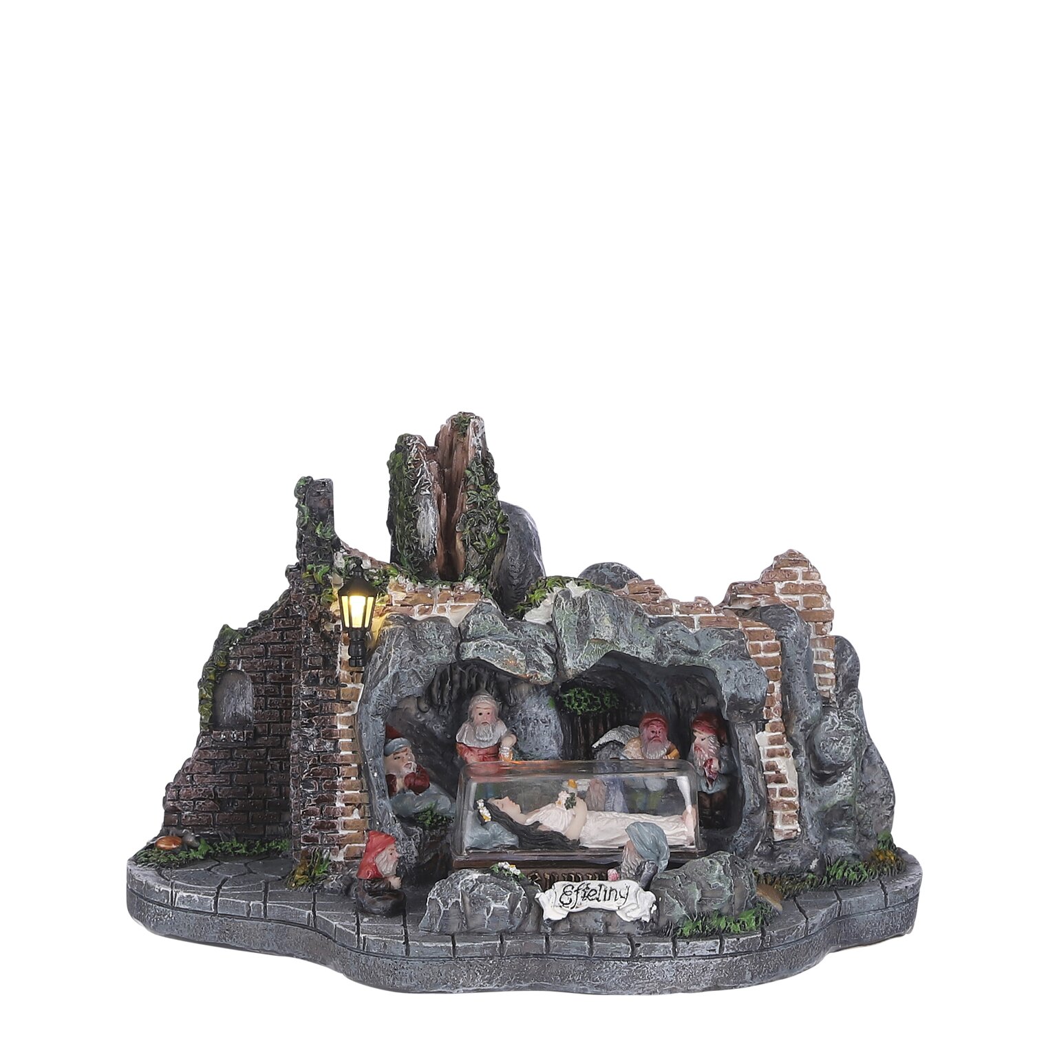 Sneeuwwitje ligt in haar glazen kist met verdrietige kabouters om haar heen. Waar is de prins? Dit tafereeltje staat in de buurt van het kabouterhuis. De verlichting zorgt voor een sprookjesachtige sfeer. Het tafereeltje is gemaakt van Polyresin en is mooi gedetailleerd. De verlichting werkt op batterijen (2 x AA) maar heeft ook een adapteraansluiting zodat de verlichting kan werken op een adapter. (niet inclusief)