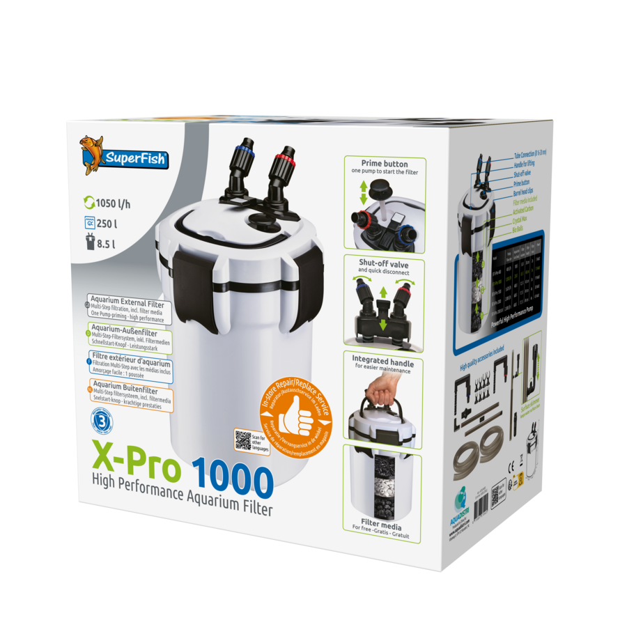 De SuperFish X Pro 1000 is een krachtig buitenfilter met een grote biologische filtercapaciteit en unieke 24uurs service gedurende de garantieperiode van 3 jaar. Het filter word compleet geleverd inclusief filtermedia, slangen, buizen, aansluitmaterialen én oppervlakte afzuiger (skimmer). De X Pro is gebruiksvriendelijke door de handige, Snelstart-knop; één keer pompen start het filter, de all-in-one afsluiter met roteerbare slangaansluiting en handgreep voor eenvoudiger onderhoud. De filterslangen zijn 360 graden draaibaar wat de plaatsing van de filter vergemakkelijkt.