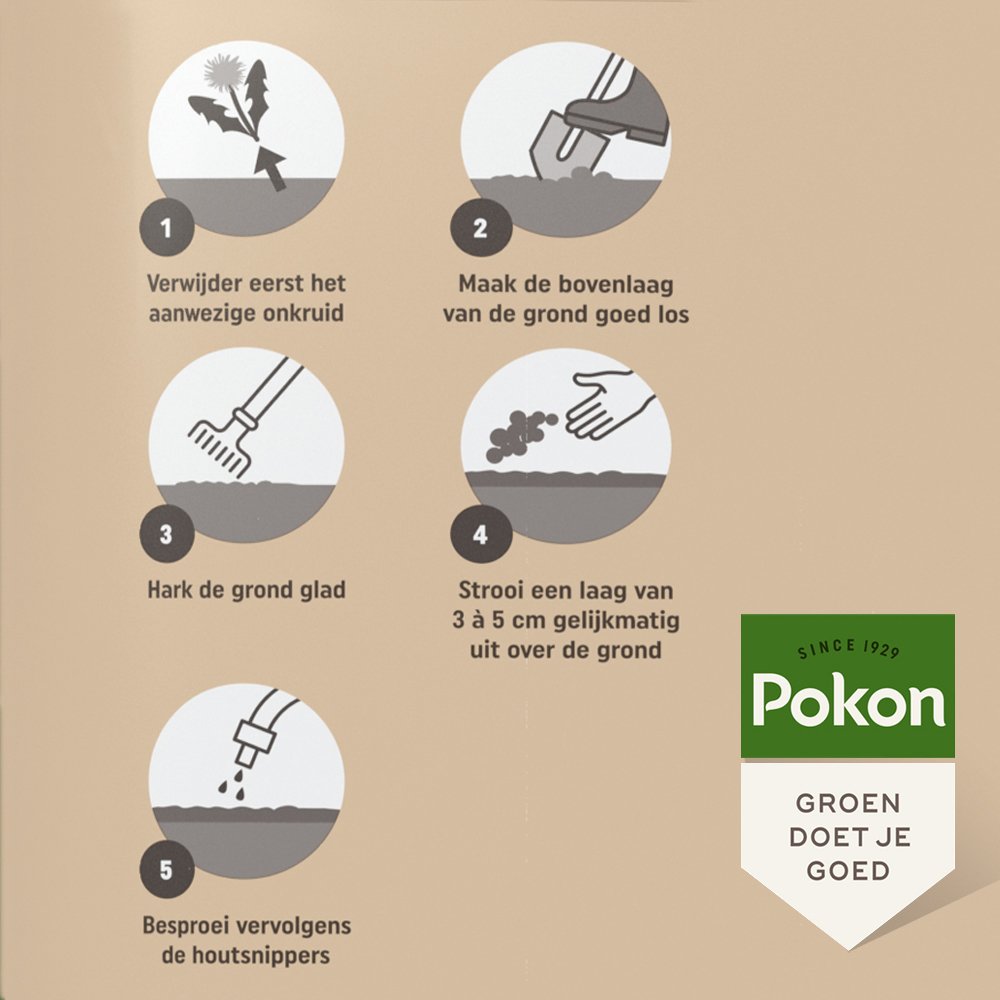 Pokon Houtsnippers Cacaobruin is een duurzame, natuurlijke bodembedekker op basis van natuurlijk gekleurd hout. Het hout is afkomstig uit PEFC beheerde bossen. Deze unieke bodembedekker is uitermate geschikt om een onkruid-werende laag in je tuin aan te brengen. Het is bovendien decoratief en duurzaam. Het reduceren van onkruid via een natuurlijke barrière zorgt dat je minder tijd hoeft te besteden aan het verwijderen van onkruid en dat je tuin er bovendien een stuk verzorgder uitziet. En het beperkt het gebruik van middelen om onkruid te bestrijden, wat ook goed past bij de huidige tijd. De grond onder deze bodembedekker krijgt bovendien een open structuur, waardoor planten beter en mooier zullen groeien. Bovendien gaat het verdamping tegen, waardoor je tuinplanten langer beschikking hebben over water bij droogte.