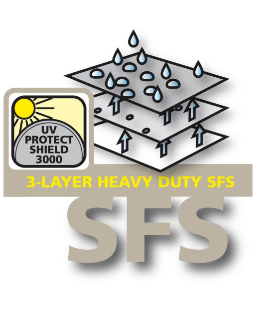 De hoes is gemaakt van een SFS-3 materiaal. Dit materiaal is voorzien van een ademend membraam wat er voor zorgt dat eventueel vocht wel uit de hoes kan, maar niet erin komt.