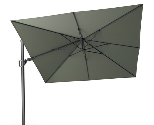 Zweefparasol Challenger T2 3x3 van Platinum. Achterwaarts en zijwaarts kantelbaar en 360 graden draaibaar. De Challenger T2 zweefparasol is uitgevoerd met een zware kwaliteit 300 grams antraciet polyester doek voorzien van water- en vuilafstotende coating en doekspanners. Dit doek heeft een hoge mate van kleurechtheid is getest in klasse 5-6 (goed - zeer goed). Gebruik een AeroCover ademende parasolhoes om uw parasol als nieuw te houden. De zweefparasol heeft het grote voordeel dat de paal van de zweefparasol niet zo nadrukkelijk aanwezig is als bij een gewone parasol en wat verder van uw tuinset geplaatst kan worden. Hierdoor kan de gehele ruimte onder de zwevende parasol benut worden. De parasol wordt zonder voet geleverd. Wij adviseren deze parasol op een 90kg parasolvoet van Platinum te plaatsen. Deze zijn met wielen leverbaar zodat de parasol makkelijk te verplaatsen is. Platinum levert ook een ingraaf parasolvoet. De ingraaf parasolvoet is geheel verwerkt in de grond. Hierdoor heeft u meer ruimte op uw terras. De ingraafvoet is makkelijk te plaatsen zonder gebruik van beton. Deze parasol wordt geleverd exclusief voet.
