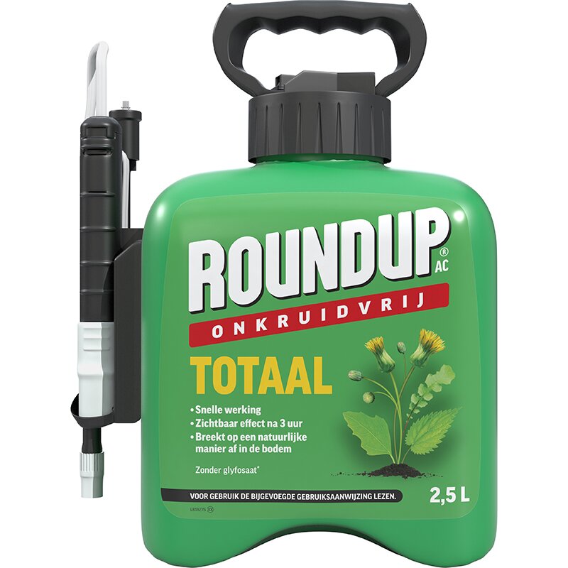 ROUNDUP® AC Totaal Onkruidvrij is een snelwerkende onkruidbestrijder: actief groeiend onkruid wordt binnen een dag gedood. Het bestrijdt diverse éénjarige onkruiden, zoals distel, klaver, paardenbloem, brandnetels, madelief en boterbloem. De werkzame stof is azijnzuur, dat voorkomt in de natuur en in kleine hoeveelheden ook in planten. Wanneer deze stof in geconcentreerde vorm op ongewenste planten wordt gespoten, verandert ze in een snelwerkende onkruidverdelger. De stof doodt heel snel verschillende lagen van de plantencellen, waardoor de groei stopt en de plant sterft. ROUNDUP® AC Totaal Onkruidvrij is snel inactief in de bodem waardoor zaaien en planten al mogelijk is 1 dag na toepassing. ROUNDUP® AC Totaal Onkruidvrij hoeft niet aangemengd te worden en is altijd juist gedoseerd. Geschikt voor het bestrijden van onkruiden tussen sierbeplanting. Kan gebruikt worden in de moestuin, voor opkomst van het gewas. Ideaal te gebruiken voor onkruiden tussen bestrating, grind, beton en onverharde terreinen.