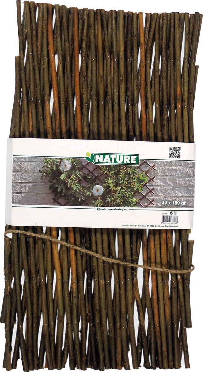 Dit verstelbare klimrek van Nature is gemaakt van natuurlijk wilgenhout en bevat een metalen pin. Het klimrek is in de breedte verstelbaar, ruitvormig en ideaal voor muurdecoratie of ondersteuning van klimplanten. Afmeting 30 x 180 cm.