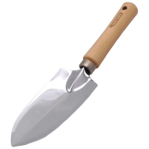 Smal plantschopje van Nature met afmeting H28,5x6,3cm van roestvrij staal 410 met schaalverdeling en handvat (H 12,5 cm) van FSC®-wilgenhout. Om kleine planten te planten en uit te poten en grond en mest te mengen. Schaalverdeling om precies tot de gewenste diepte te steken. Geschikt voor de tuin, potten en bakken.