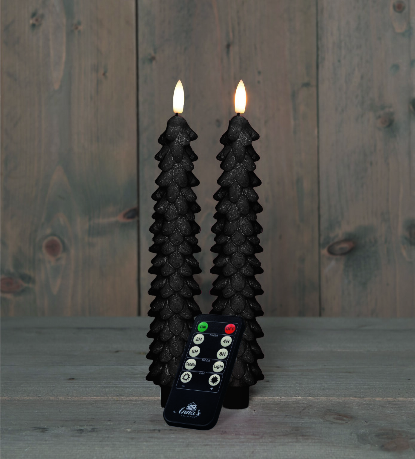 Deze set van 2 dinerkaarsen in de vorm van een kerstboom is perfect voor het creëren van een gezellige sfeer tijdens de feestdagen. De kaarsen zijn gemaakt van wax en hebben een realistische 3D vlam die op LED-verlichting werkt. Hierdoor zijn ze veilig in gebruik en kunnen ze worden bediend met de bijgeleverde afstandsbediening. Met een hoogte van 23 cm zijn deze kaarsen een prachtige toevoeging aan je kerstdecoratie. De kaarsen zijn uitgevoerd in een stijlvolle zwarte kleur en worden geleverd exclusief batterijen. Voeg een vleugje magie toe aan je kersttafel of interieur met deze sfeervolle dinerkaarsen in de vorm van kerstbomen. Perfect voor een warme en feestelijke ambiance tijdens de feestdagen.