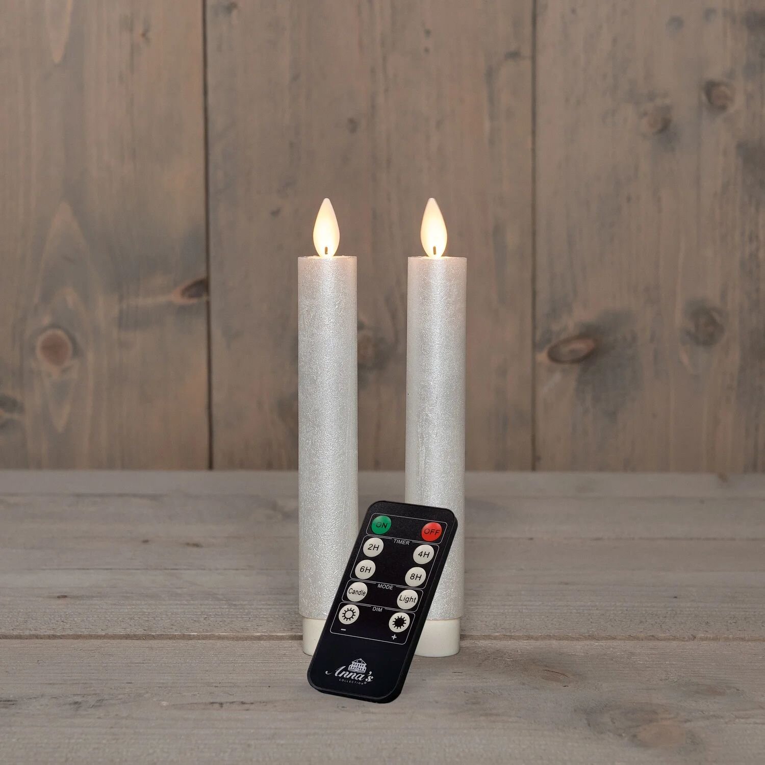 Deze set van 2 dinerkaarsen met bewegende vlam op batterij is een prachtige toevoeging aan elk diner of interieur. Met een hoogte van 18 cm en een parelachtige afwerking in een elegante ivoorkleur, zorgen deze kaarsen voor een sfeervolle ambiance. De LED-verlichting bootst op realistische wijze een dansende vlam na, waardoor de kaarsen veilig en herbruikbaar zijn. De bijgeleverde afstandsbediening maakt het eenvoudig om de kaarsen aan en uit te zetten, waardoor ze ideaal zijn voor gebruik op tafel of in decoratieve arrangementen. Let op: batterijen zijn niet inbegrepen. Voeg een vleugje warmte en gezelligheid toe aan elke gelegenheid met deze prachtige dinerkaarsen.