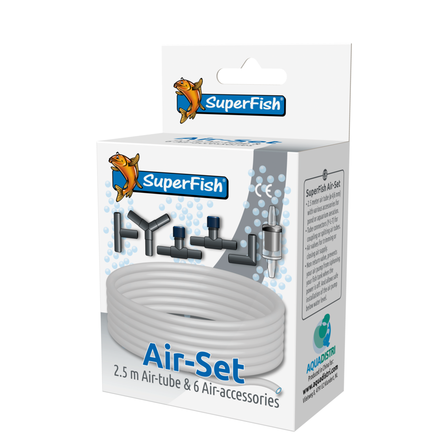 Handige set met alles wat je nodig hebt om jouw luchtpomp op het aquarium aan te sluiten, slang, aansluitstukken, kranen en een terugslagventiel om de luchtpomp veilig aan te sluiten.