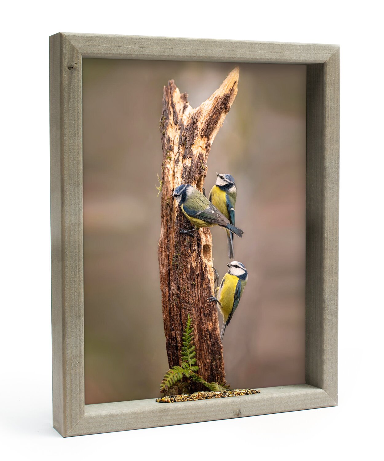 Super schattig, deze pimpelmeesjes op een boomstam. Verticale print. All Seasons