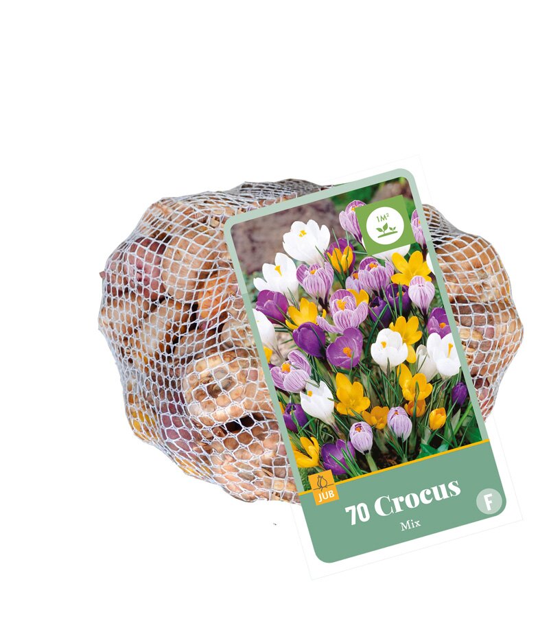 Een netlon verpakking met 60 gemengde grootbloemige Crocussen. Mooi in combinatie met Scilla, Puschkinia en Chionodoxa. In iedere tuin is er altijd wel plaats voor een paar mooie groepen van kleurrijke Crocussen. Voor zowel in de border als in potten op terras of balkon. Zeer geschikt voor verwildering Perfect voor een sfeervolle voorjaarstuin.