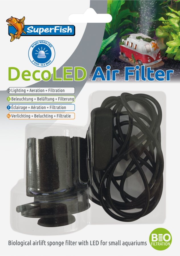 DecoLED Air Filter 3-in1: Verlichting + Beluchting + Filtratie, Effectief biologisch air lift sponsfilter met opgebouwde LED verlichting.