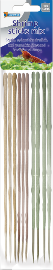 De Superfish Shrimp Stick is een heerlijke gezonde snack voor jouw garnalen. De Sticks zijn gemaakt van ingrediënten die de groei, kleur en kweek van garnalen bevorderen en rijk aan mineralen. Inhoud 10 sticks, aanvullend voer, gebruik 1 stick per 50 garnalen, 2 tot 3 keer per week.