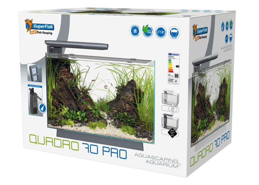 De Superfish Quadro 70 is een modern aquarium, ontworpen voor gebruiksgemak en ideaal voor mensen die op zoek zijn naar een mooi aquarium, maar weinig tijd willen besteden aan het onderhoud. Het geintegreerde filtersysteem houdt het aquariumwater schoon en is voorzien van ruimte voor de aquariumverwarmer die daarmee veilig en uit het zicht kan worden gemonteerd.