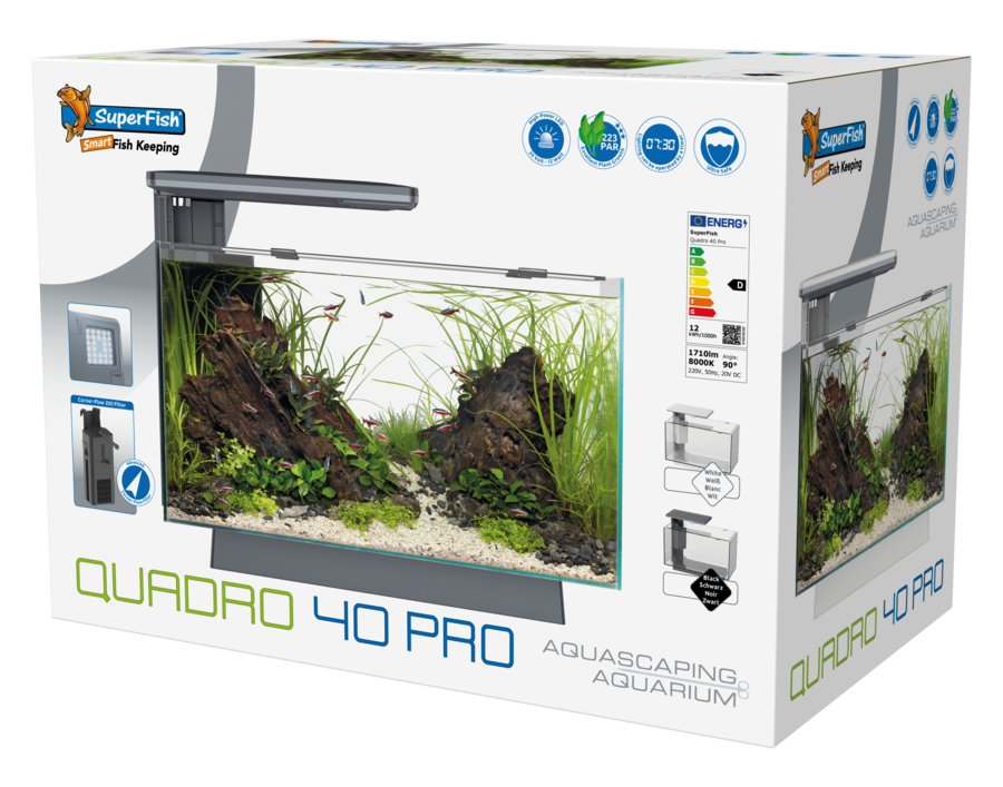 De Superfish Quadro 40 is een modern aquarium, ontworpen voor gebruiksgemak en ideaal voor mensen die op zoek zijn naar een mooi aquarium, maar weinig tijd willen besteden aan het onderhoud. Het geintegreerde filtersysteem houdt het aquariumwater schoon en is voorzien van ruimte voor de aquariumverwarmer die daarmee veilig en uit het zicht kan worden gemonteerd.ringen.