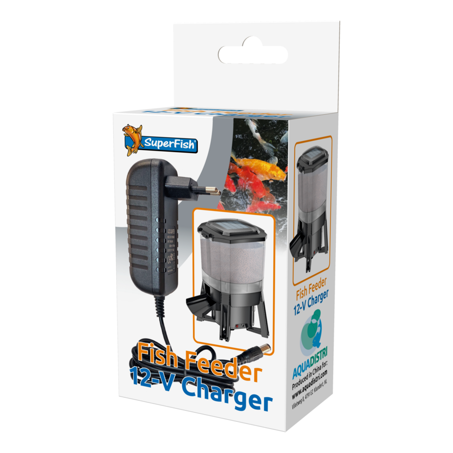 Lader voor de SuperFish Solar Feeder, met deze 12volt lader kunt u de feeder volledig opladen zonder zonlicht, handig voor binnen gebruik of in de winter, na de laadbeurt werkt de voerautomaat circa 3 maanden zonder zonlicht.