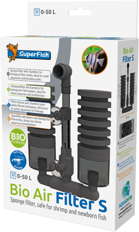 Handig luchtfilter met sponzen en een mediakamer voor biologische filtermedia, ideaal voor kleine aquaria en kweekbakken.