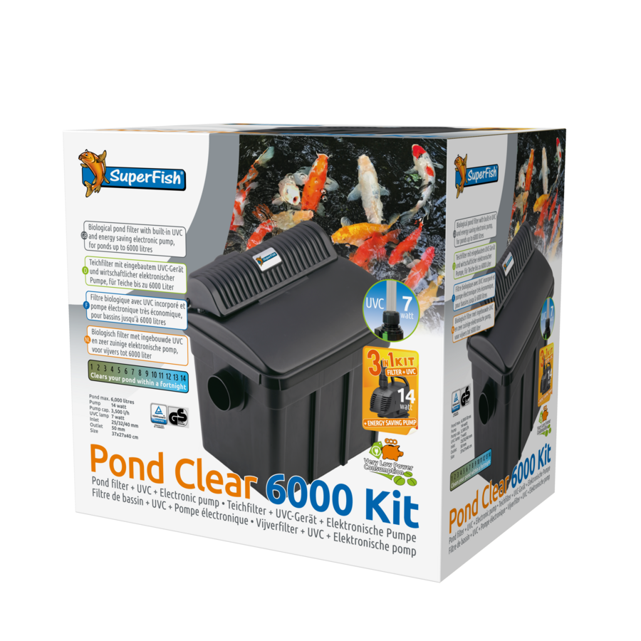 De Pond Clear 6000 Kit is een compleet biologisch vijverfilter met ingebouwde UVC voor helder water en een krachtige elektronische vijverpomp met een zeer laag energieverbruik.