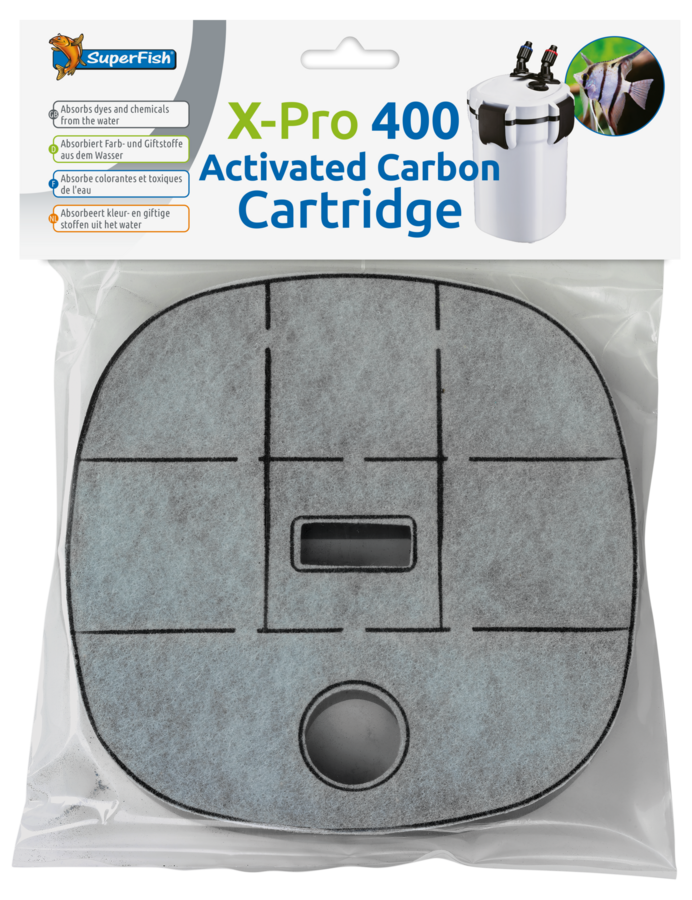 X Pro vervangingscartridges met actieve kool. Verkrijgbaar in vijf verschillende maten voor X Pro 400, 1000, 1500, 2000 en 2000 UV, elk filter heeft een ander formaat cartridge.