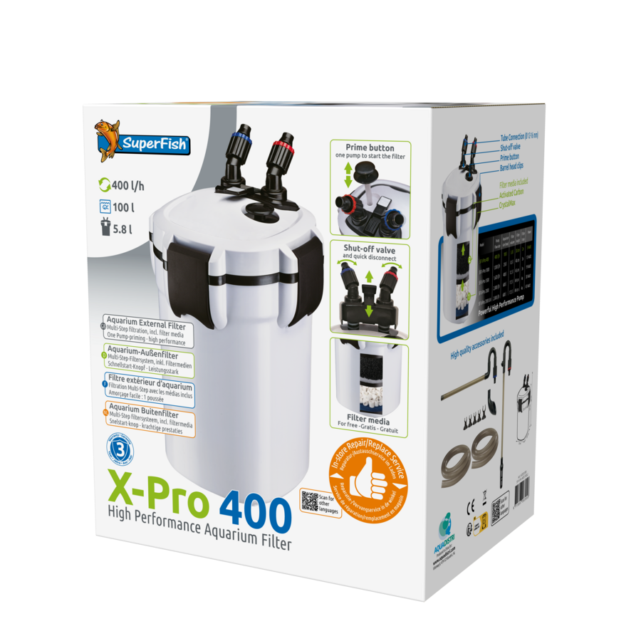 De SuperFish X Pro 400 is een krachtig buitenfilter met een grote biologische filtercapaciteit en unieke 24uurs service gedurende de garantieperiode van 3 jaar. Het filter word compleet geleverd inclusief filtermedia, slangen, buizen, aansluitmaterialen én oppervlakte afzuiger (skimmer). De X Pro is gebruiksvriendelijke door de handige, Snelstart-knop; één keer pompen start het filter, de all-in-one afsluiter met roteerbare slangaansluiting en handgreep voor eenvoudiger onderhoud. De filterslangen zijn 360 graden draaibaar wat de plaatsing van de filter vergemakkelijkt.