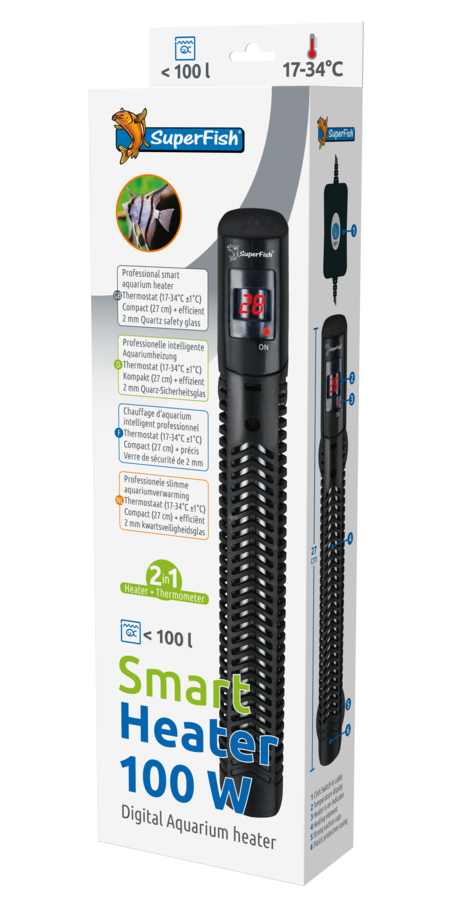 Digitale Smart aquariumverwarming met ingebouwde thermometer. Compact en efficiënt met een nauwkeurige digitale temperatuurinstelling/aanduiding. De gevoelige en betrouwbare thermostaat (17-34°C) zorgt voor een constante watertemperatuur.