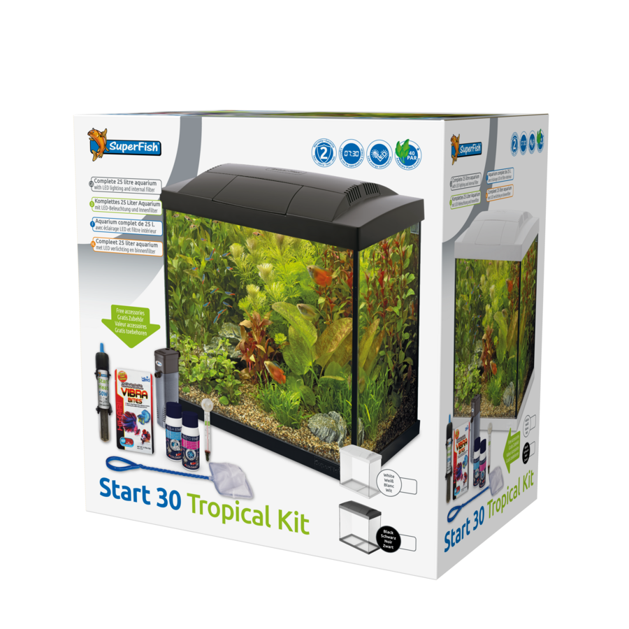 Compleet geleverd inclusief energiezuinige LED verlichting, binnenfilter, aquariumverwarmer, waterbereiding, schepnetje en aquarium thermometer, klaar voor de start.