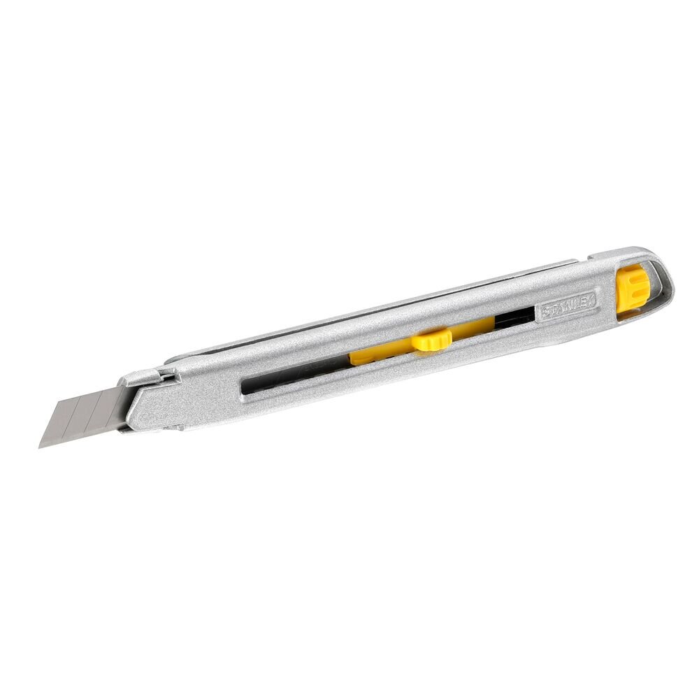 Het STANLEY Interlock 9 mm mes heeft een gepatenteerde vergendeling voor het reservemes binnenin het mes. De gegoten metalen behuizing is bestand tegen oplosmiddelen. Geen gereedschap nodig bij het verwisselen van het reservemes.
