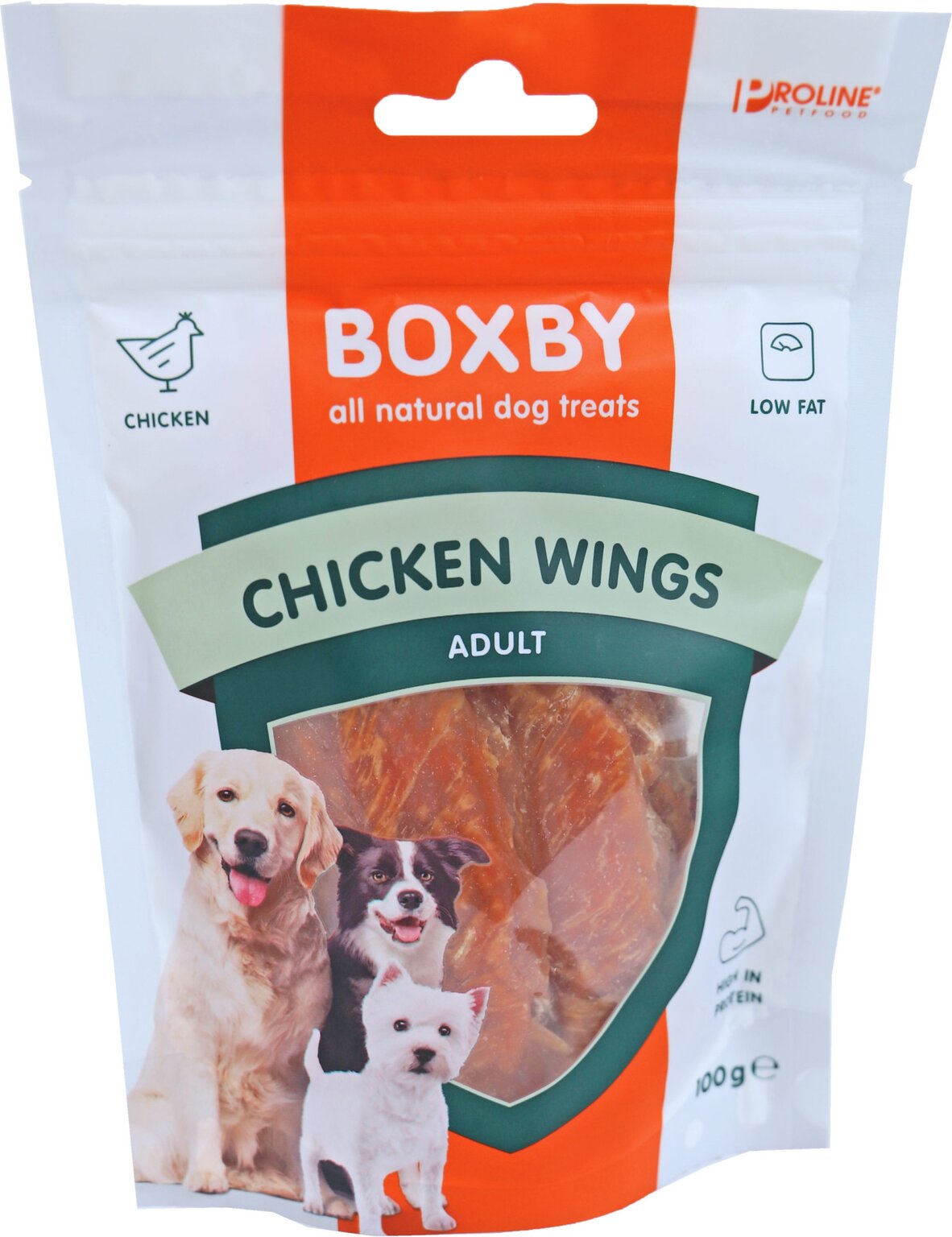 Proline Boxby kipwings is eiwitrijk, met laag vetgehalte, 100% puur vlees gesneden van de kippenborst. Inhoud: 100 gram.