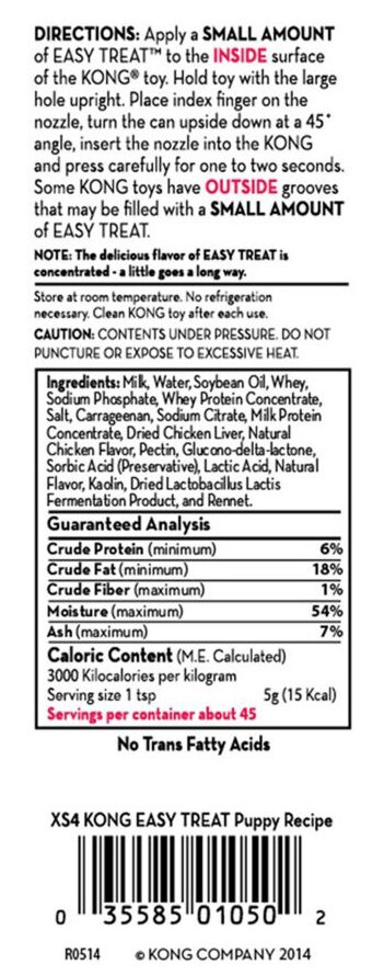 KONG Easy Treat Puppy is uniek geformuleerd om aan de behoeften van puppy's te voldoen. Het kippenleverrecept zal zeker pups verleiden en actief maken, terwijl het een gemakkelijke oplossing biedt voor de baasjes. KONG Easy Treat Puppy is een verleidelijk heerlijke toevoeging wanneer het wordt toegevoegd aan een gevulde Puppy KONG. Een uniek ontworpen spuitmond regelt gemakkelijk de hoeveelheid KONG Easy Treat en heeft het extra voordeel van een handige, knoeivrije oplossing. Hulp nodig bij zindelijkheidstraining? Voeg KONG Easy Treat Puppy toe aan uw Puppy KONG-vulling voor een aangename trainingservaring.