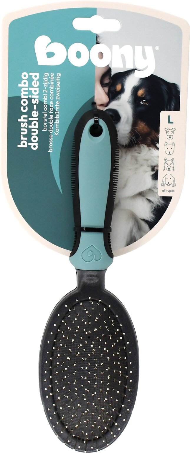 Dubbele verzorging voor een stralende vacht._x000D_\nMet deze praktische combi-borstel haal je twee essentiële borstels in één handig product. Ideaal voor hondenbezitters die gemak, effectiviteit en veelzijdigheid zoeken. De borstel combineert een nylon zijde voor het verwijderen van vuil en een stalen zijde voor het losmaken van dode en losse haren._x000D_\n_x000D_\nNylon zijde voor alle vachttypes_x000D_\nDe zachte nylon haren verwijderen moeiteloos vuil en stof uit de vacht. Geschikt voor alle hondenrassen, ongeacht vachtlengte of -structuur. Deze zijde helpt de vacht fris, schoon en glanzend te houden._x000D_\n_x000D_\nStalen zijde voor lang- en stockharige honden_x000D_\nDe stalen pinnen, geplaatst op een flexibele rug, maken het eenvoudig om door dikkere of langere vachten te borstelen. Zonder veel kracht te zetten kam je door de haren heen, zonder de huid te beschadigen. Ideaal voor langharige en stockharige honden._x000D_\n_x000D_\nOnderhoud voor een gezonde vacht._x000D_\nRegelmatig borstelen met deze combi-borstel voorkomt klitten, stimuleert de bloedsomloop en houdt de vacht in topconditie. Borstel altijd in de richting van de haargroei voor het meest comfortabele resultaat.