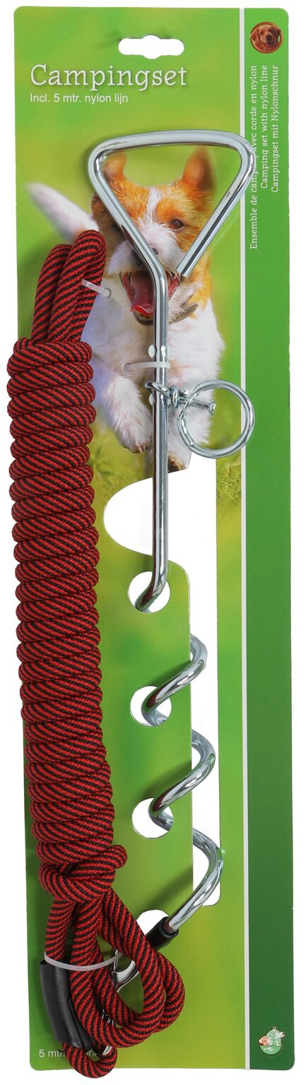 Campingset met draaipen en 5 meter nylon lijn. Geschikt voor diverse omstandigheden zoals bijvoorbeeld op het strand of op de camping. Met wartel dit voorkomt dat de kabel achter de draaipen blijft steken._x000D_\n_x000D_\nGebruiksaanwijzing: draai de pen in de ondergrond, bevestig de lijn met de lus aan het oog met de wartel. Het andere eind bevestigd u aan de halsband of het tuig van uw hond. Uw campingset is klaar voor gebruik.