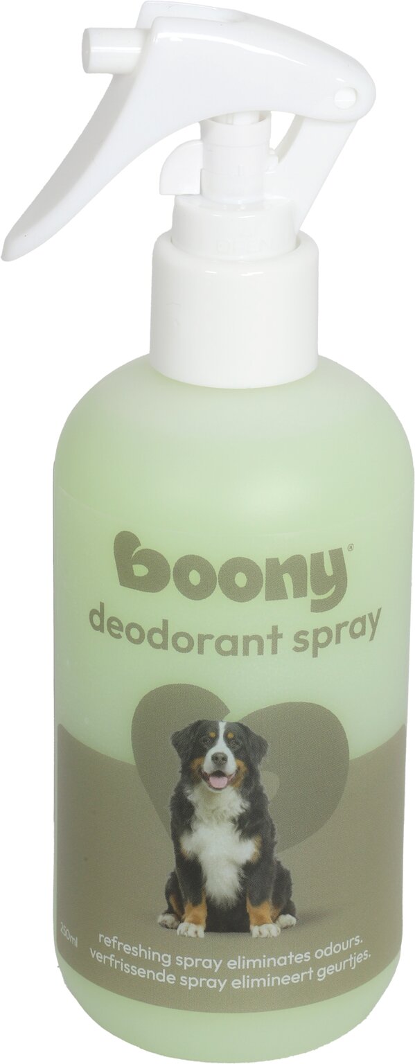 Boony Deodorant Spray voor Honden - voor een frisse geur, zelfs na een regenwandeling_x000D_\n_x000D_\nBoony Deodorant Spray voor Honden elimineert en neutraliseert onaangename geurtjes en laat uw hond weer heerlijk fris ruiken met een subtiele parfum. De spray kan zowel op een droge als natte vacht worden toegepast, waardoor het ideaal is na een wandeling in de regen._x000D_\n_x000D_\nDe PH-neutrale formule zorgt voor een mild karakter, waardoor de deodorant spray ook geschikt is voor honden met een licht gevoelige huid._x000D_\n_x000D_\n- Elimineert onaangename geurtjes en laat uw hond fris ruiken_x000D_\n- Ideaal voor gebruik na een regenwandeling_x000D_\n- PH-neutrale formule, geschikt voor gevoelige huid_x000D_\n- Geschikt voor zowel droge als natte vacht_x000D_\n_x000D_\nHoud uw hond fris en geurend met de Boony Deodorant Spray voor Honden!