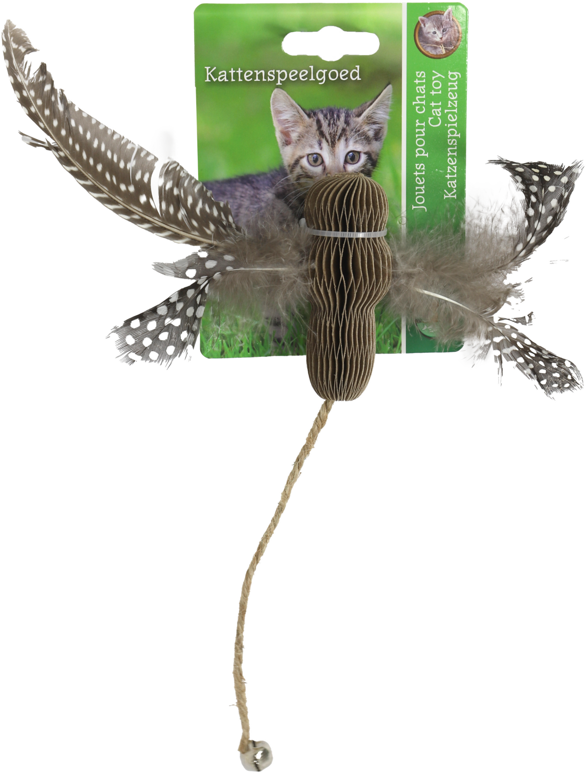 Laat uw kat fladderen van blijdschap met onze kartonnen libelle! Deze speelse libelle, gemaakt van stevig karton, is voorzien van sierlijke veren als vleugels en een speels touwtje met een vrolijk klingelend belletje. Een onweerstaanbare combinatie voor iedere nieuwsgierige kat die dol is op jagen en spelen! De zachte veren imiteren de beweging van echte vleugels, wat het natuurlijke jachtinstinct van uw kat aanwakkert. Het speeltouwtje en het belletje zorgen voor beweging en geluid, waardoor uw kat urenlang geboeid blijft. Perfect voor zowel zelfstandig spelen als interactieve speelsessies met u! Geef uw pluizenbol het ultieme speelplezier en maak van iedere dag een avontuur met de karton libelle!