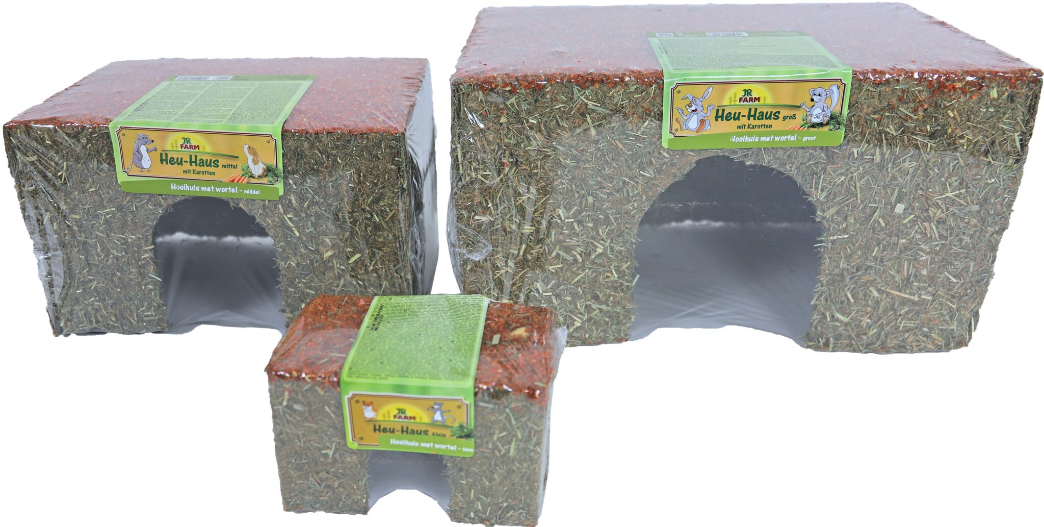 Het hooi-huis wortel is bedekt met aromatisch bergweidehooi uit inheemse, natuurlijke weilanden in het hart van Beieren en heeft een heerlijk dak met krokante wortelstukjes. Het dient als een schuilplek voor kleine dieren zoals hamsters en muizen en kan met plezier geknaagd worden. Het hoge gehalte aan ruwe vezels in het hooi ondersteunt de fysiologische slijtage van de levenslang groeiende nageltanden tijdens het knagen. De vezelrijke wortelen voorzien de dieren ook van waardevol bètacaroteen en hebben een positieve invloed op het spijsverteringsstelsel. Aangezien alleen natuurlijke grondstoffen worden gebruikt, kan het hooi-huis ook volledig gegeten worden.