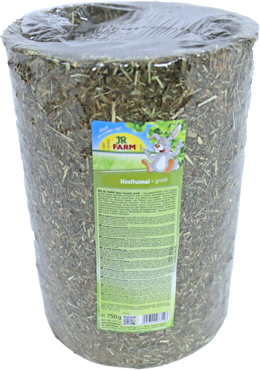 De hooitunnel is bedekt met aromatisch bergweidehooi uit inheemse, natuurlijke weilanden in het hart van Beieren en bevat een hoog gehalte aan ruwe vezels, die de fysiologische slijtage van de levenslang groeiende nageltanden ondersteunen tijdens het knabbelen. Door het gebruik van uitsluitend natuurlijke grondstoffen kan de hooitunnel volledig gegeten worden. De tunnel is ongeveer 30 cm lang en heeft een diameter van 20 cm.