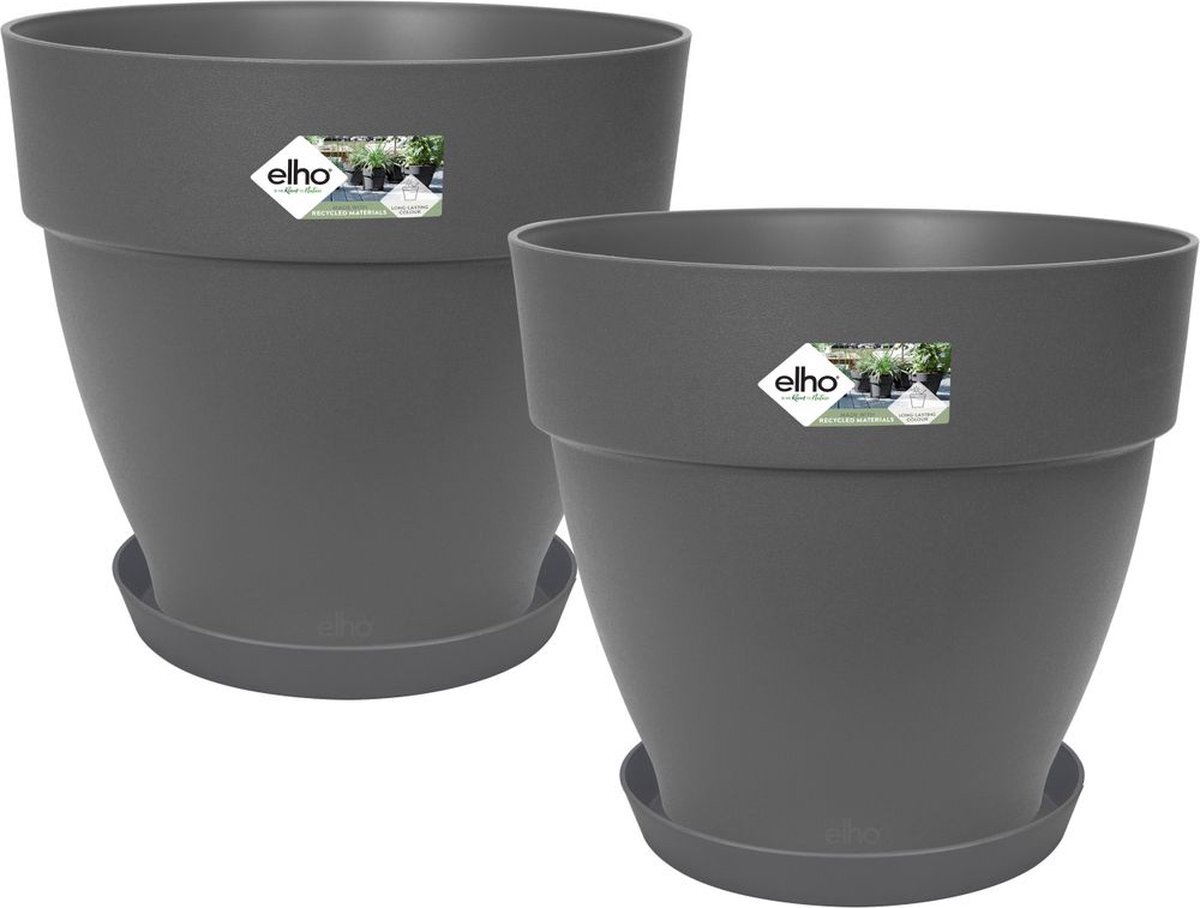 Deze set bestaat uit 2 elho Vibia Campana bloempotten met een diameter van 30 cm, in combinatie met bijpassende onderschotels.