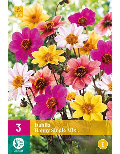 De dahlia mix 'Happy Single Mix' is een dankbare zomerbloeier die u maandenlang plezier geeft. Dahlia's bloeien de hele zomer van juli tot de eerste nachtvorst. Deze dahlia's worden ongeveer 60 cm. hoog. Soms is het nodig om de bloemstengels te steunen.
