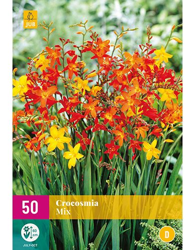 Crocosmia mix is een mooie mix van Crocosmia's voor de border. De bloemen die in juli-oktober te zien zijn, vallen goed op tussen de andere planten in uw tuin en borders. Crocosmia 'Mix' wordt ongeveer 50-60 cm. hoog en groeit het beste op een zonnig standplaats. Deze Crocosmia is ook geschikt als snijbloem. De 10 bollen van Crocosmia 'Mix' direct na ontvangst in de volle grond of in een bloempot planten. Pas wel op voor late (nacht)vorst. De plantdiepte is 10 cm. De plantafstand van Crocosmia 'Mix' is ongeveer 10 cm. Maak voor grotere oppervlakken een ruimer plantgat en plaats hier een aantal bollen in. Crocosmia ‘Mix’ is goed te combineren met diverse vaste planten en dahlia’s in dezelfde of juist contrasterende kleuren.