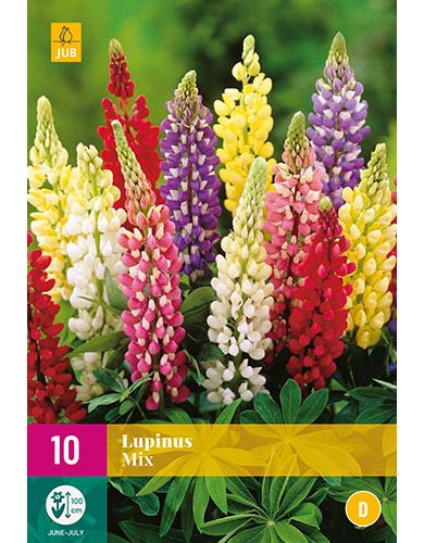 Lupinus gemengd groeit prima in de volle grond. Het frisgroene blad van de lupine is handvormig samengesteld en blijft onder de bloemen. De bloemen zitten in lange trossen rondom de stengels. Hoogte 90-100 cm.