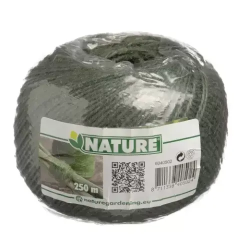 IJzersterk en natuurlijk jutetouw van Nature. Het groene jutetouw valt niet op in de tuin dankzij de groene camouflage kleur en kan op vele manieren gebruikt worden. Lengte 250 m.